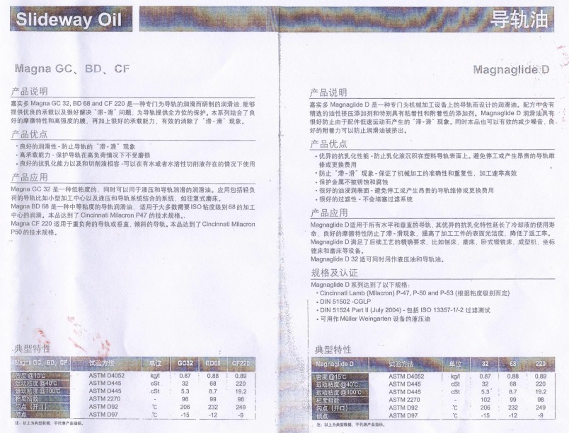 適用于所以水平和垂直的導(dǎo)軌,其優(yōu)異的抗乳化特性延長了冷卻液的使用壽命,良好的摩擦特性防止了滯-滑現(xiàn)象,提高了加工工件的表面光潔度,降低了返工率。